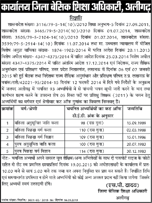 Date 18-05-2015 District Basic Education Officer at the office today, Chitrakute, balrampur and Aligarh selection list has been released by the trainee. Included in the list of all candidates to be present with all his records can get your appointment letter.